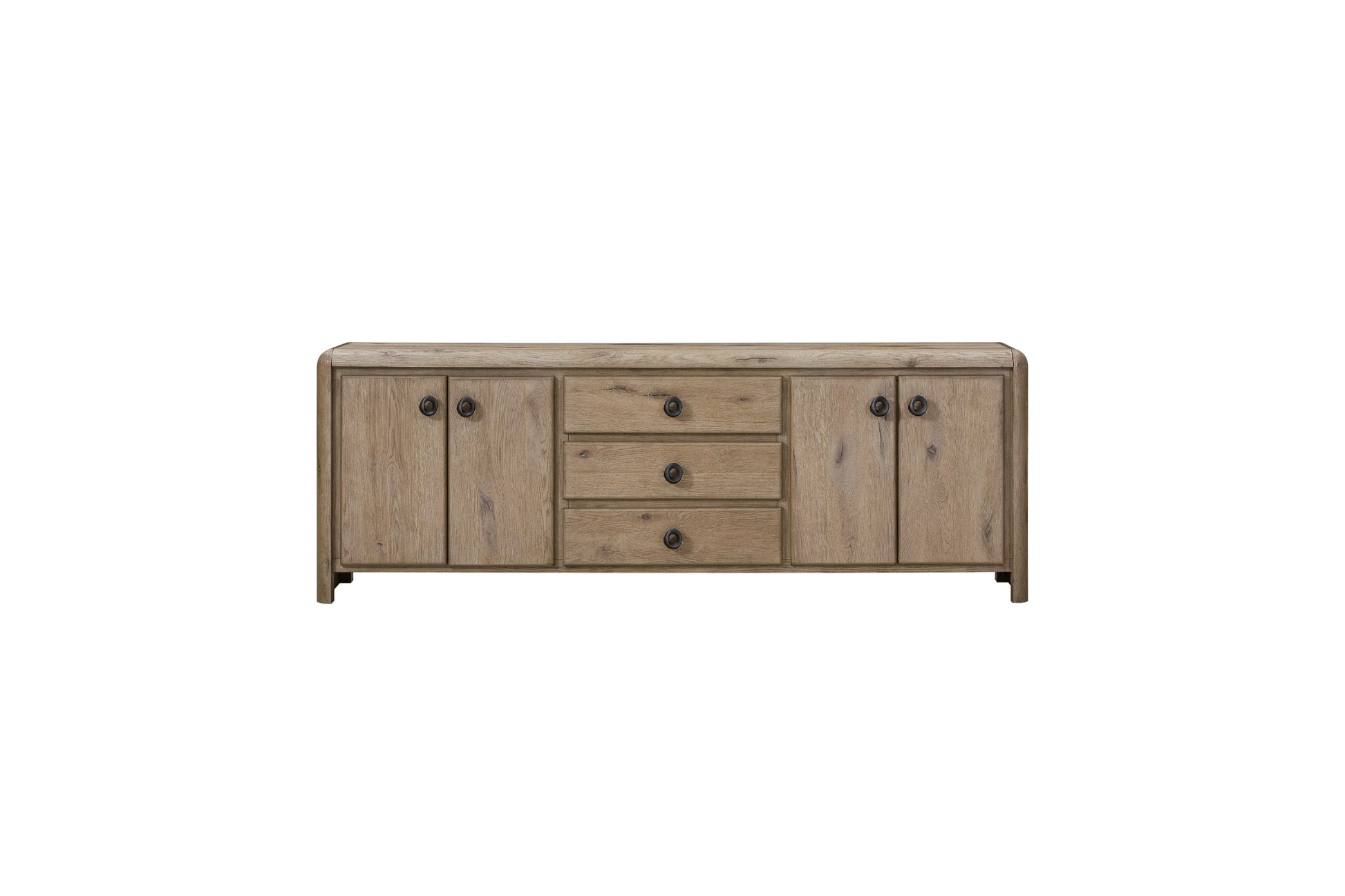 The Pagosa 84" Console offers a striking blend of organic texture and refined design. Crafted from richly grained oak wood with curved edges, it brings warmth and sophistication to any space. Three center drawers and two spacious cabinets provide ample storage, seamlessly concealed behind bold black iron handles. Thoughtfully designed for both style and function, this console is an elegant foundation for entertainment, display, or everyday essentials. Its balanced proportions and timeless craftsmanship make it a versatile statement piece.