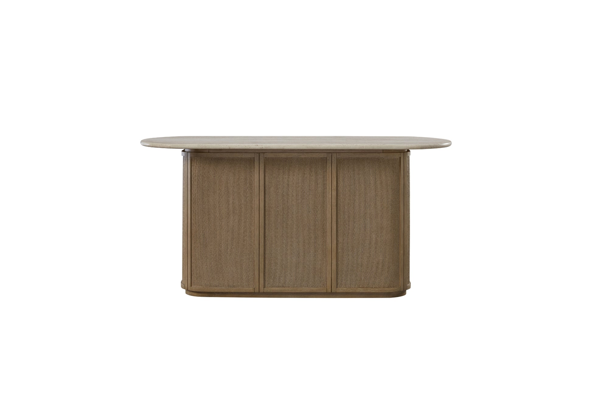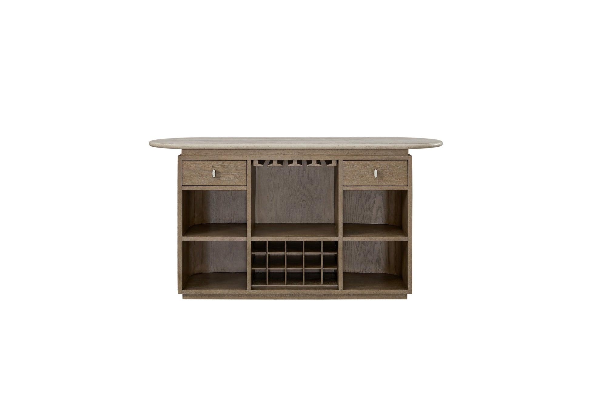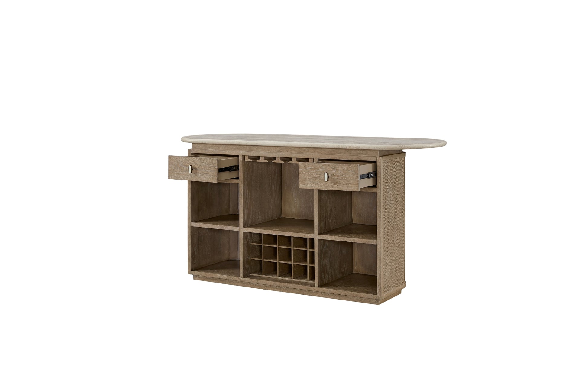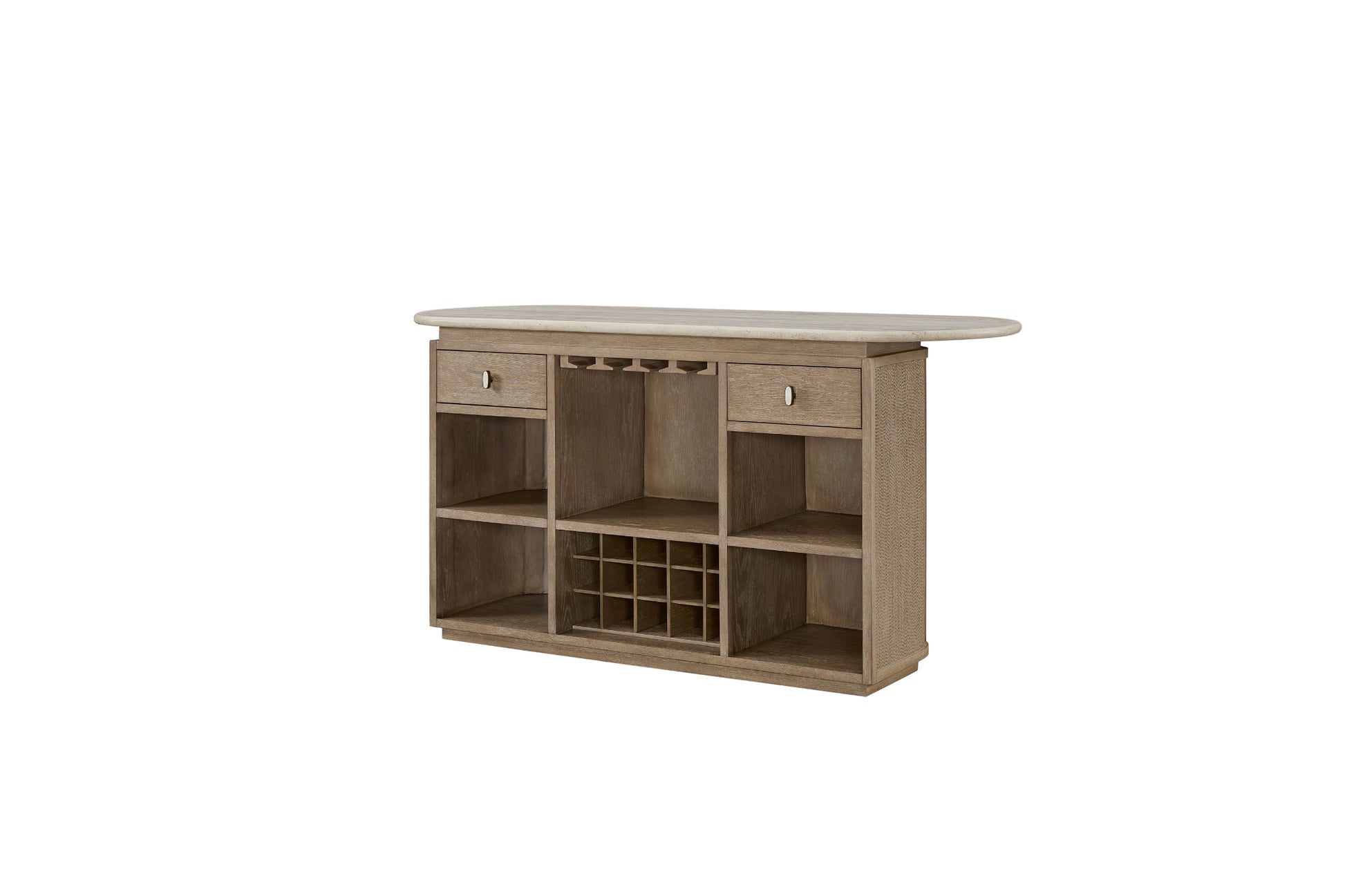 The Trilogy Bar blends sculptural elegance with functional versatility, making it a standout piece for entertaining. Its gently curved front is wrapped in woven detailing for a warm, organic texture, while the light stone-look top adds a refined contrast. Behind the bar, ample open shelving, dual drawers, a hanging stemware rack, and a built-in wine bottle grid provide organized storage for all your hosting essentials. Thoughtful craftsmanship and a soft, earthy finish make this bar a perfect balance of beauty and practicality. Whether you're mixing cocktails or creating a cozy gathering spot, the Trilogy Bar elevates the experience.