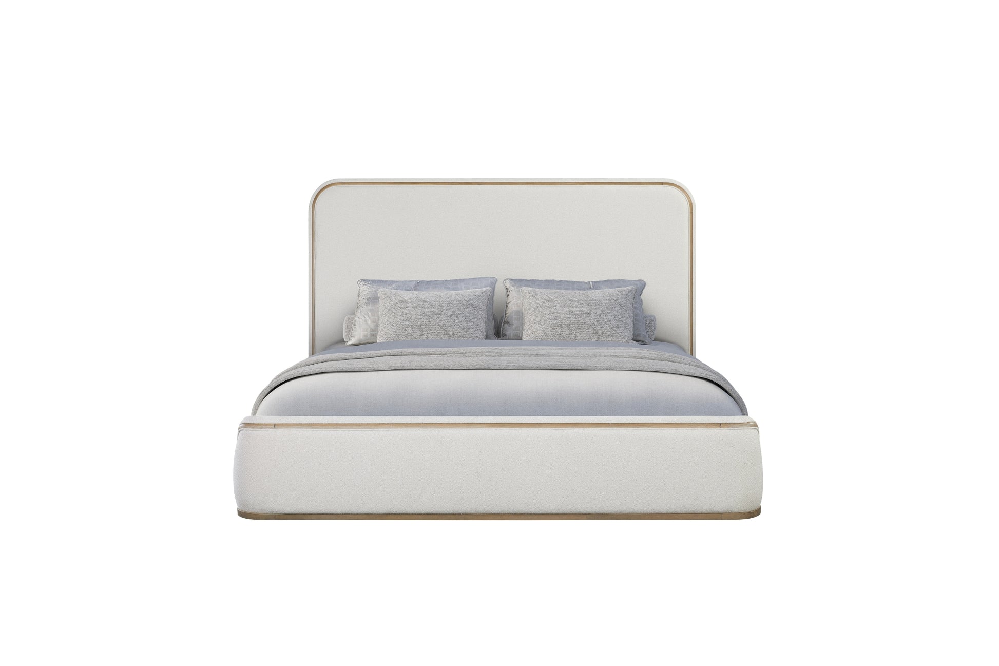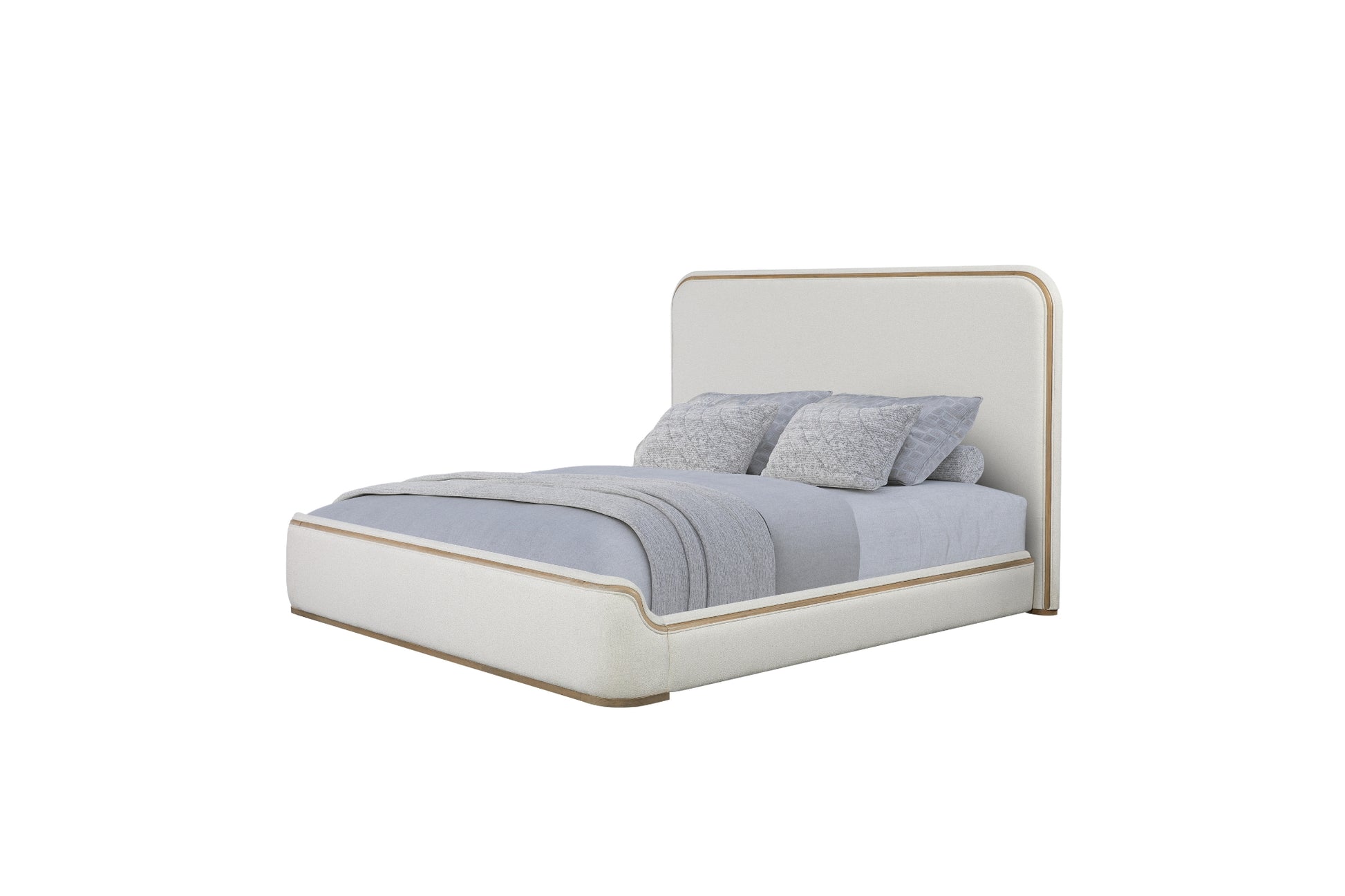 The Toffee Upholstered Bed blends soft sophistication with modern design, featuring a gently curved headboard wrapped in a warm, neutral fabric. Contrasting wood trim highlights its elegant silhouette, while bolster-style side cushions add a unique touch of comfort and support. The low-profile frame enhances its contemporary appeal, making it a perfect statement piece for refined, serene bedrooms. Crafted with high-quality materials, this bed offers both durability and luxurious comfort. Pair it with coordinating pieces to create a cohesive and stylish retreat.